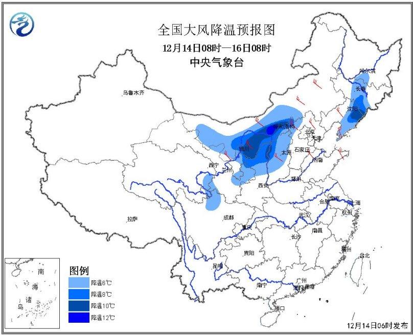Affected by strong cold air, from 14th to 17th, there will be a large-scale gale and cooling weather in most parts of central and eastern China from west to east and from north to south, with the average temperature generally dropping by 4 ~ 8℃. The local cooling range in south-central Inner Mongolia, northwestern Shaanxi, eastern Jilin and eastern Liaoning can reach more than 10℃. In the early morning of the 18th, the daily minimum temperature of 0℃ will be located in central and southern Hunan, central and southern Jiangxi and central Fujian. Among them, from 08: 00 on the 14th to 08: 00 on the 16th, the temperature in the central and western Inner Mongolia, western North China, northeastern Northwest China, central Jilin and eastern Liaoning will drop by 6 ~ 8℃, and the temperature in the south-central Inner Mongolia, northwestern Shaanxi and northeastern Liaoning will reach more than 10℃, and there are 4 ~ 6 winds in most of the above areas (see Figure 1). The Central Meteorological Observatory issued a gale cooling forecast at 06: 00 on December 14th.